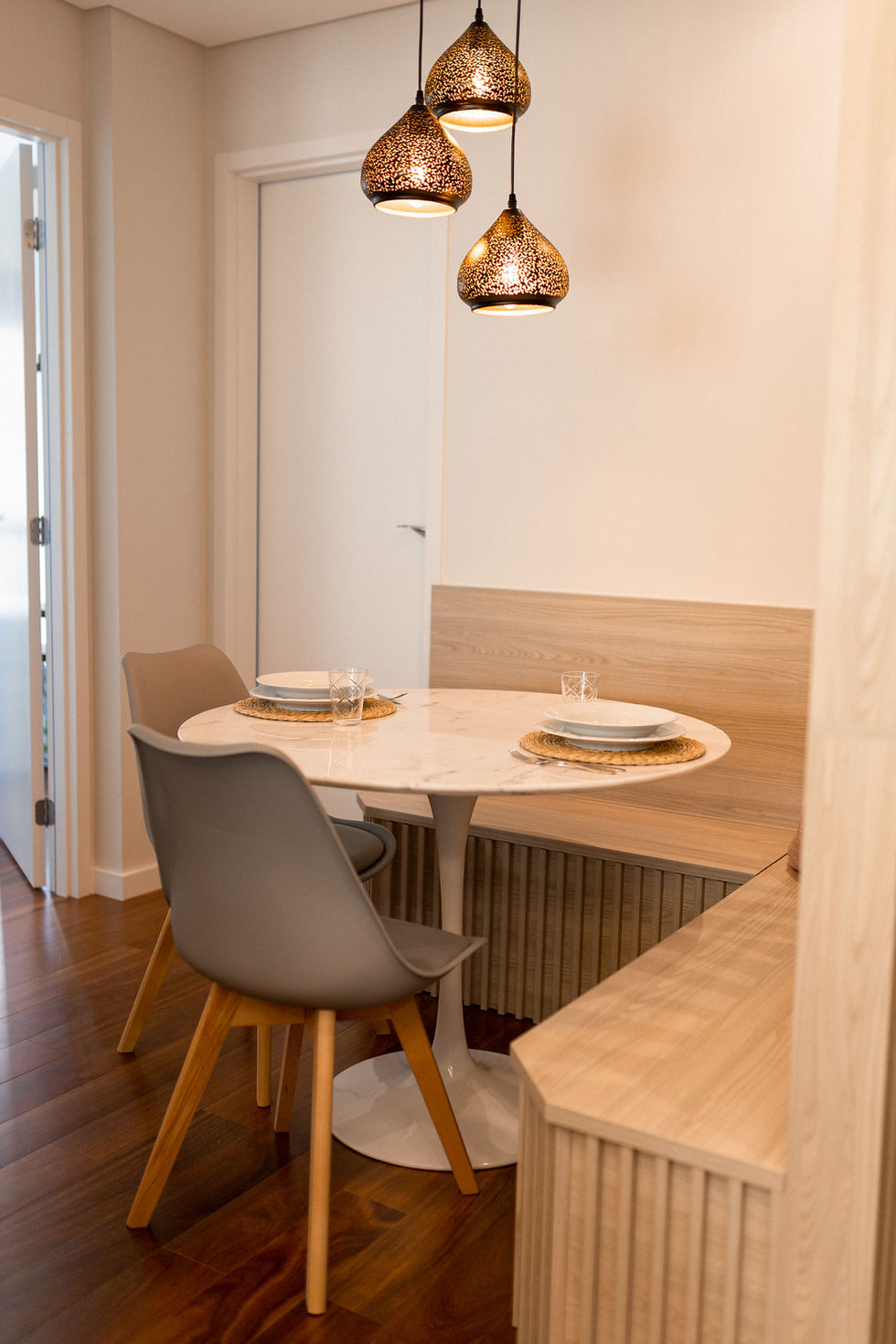 Com a chegada deles ao país, realizamos visitas em loja para validar escolhas e fechar detalhes da marcenaria, garantindo que tudo refletisse suas expectativas. Acompanhei a execução da obra até a entrega final, organizando cada etapa para que o processo fosse mais tranquilo e seguro.